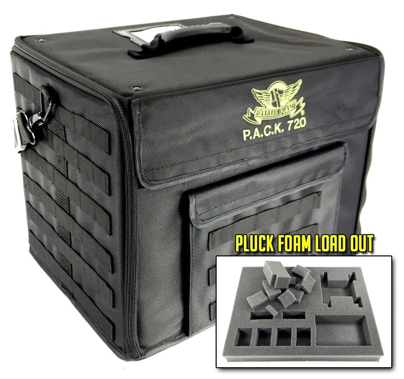 The P.A.C.K. (Personal Army Combat Kit) 720 can fit 12 inches (305 mm) of Battle Foam Large (BFL) size foam trays (15.5W x 12L”). Its rugged, black Ballistic Nylon exterior protects a hard plastic interior built for strength and durability. The P.A.C.K. 720 now offers a molle system, which allows you to further customize this bag to fit your specific storage and transportation needs. Molle accessories offer storage solutions for tablets and other small books, dice and other gaming accessories as well as cell phones and other personal items. To view and/or purchase these accessories, click here.