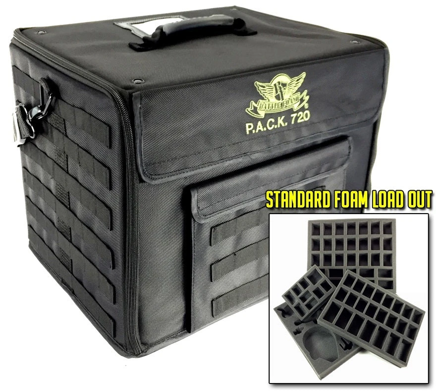 The P.A.C.K. (Personal Army Combat Kit) 720 can fit 12 inches (305 mm) of Battle Foam Large (BFL) size foam trays (15.5W x 12L”). Its rugged, black Ballistic Nylon exterior protects a hard plastic interior built for strength and durability. The P.A.C.K. 720 now offers a molle system, which allows you to further customize this bag to fit your specific storage and transportation needs. Molle accessories offer storage solutions for tablets and other small books, dice and other gaming accessories as well as cell phones and other personal items. To view and/or purchase these accessories, click here.