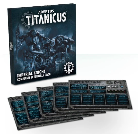 For each banner of Knights you field, you require a Command Terminal, which provides a detailed surface on which to track the status, damage and weapons of your Knights, as well as the Orders you’ve issued to them each turn. This set of five large-format card Command Terminals includes enough to add several banners of Knights to your games of Adeptus Titanicus.