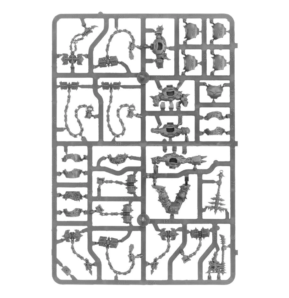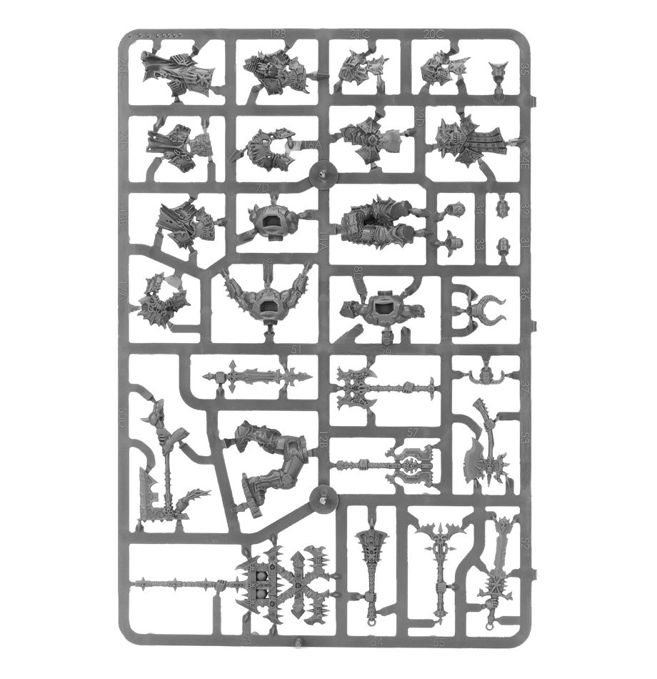 This multi-part plastic kit makes either five Khorne Wrathmongers or five Khorne Skullreapers. There are five sets of armoured legs (one of which is designed to look like a Bloodletter) and a choice of 10 torsos that can be used to form the basis of the models. Alongside this, there is a choice of 10 individually designed sets of armour that fit to the torso fronts with the option to add additional shoulder armour. Whichever unit type you choose to make there are enough parts to include a champion and standard bearer for either.