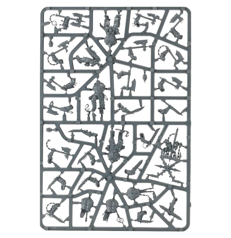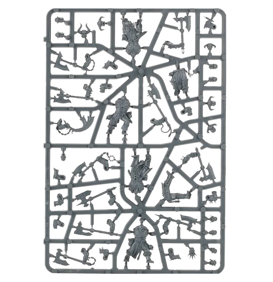This multi-part plastic kit contains everything you need to make twenty Bloodreavers, armed with either Reaver Axes or Meatripper Axes (twenty of each are included). Thirty-six heads, a mix of helmeted and bare, are included for customisation along with twenty parrying blades. You also have the option to build one model as a chieftain, wielding a double-bladed axe and carrying grisly trophies, one model as a hornblower and one model as an icon bearer, with a detailed banner. Included are twenty Citadel 32mm Round Bases.
