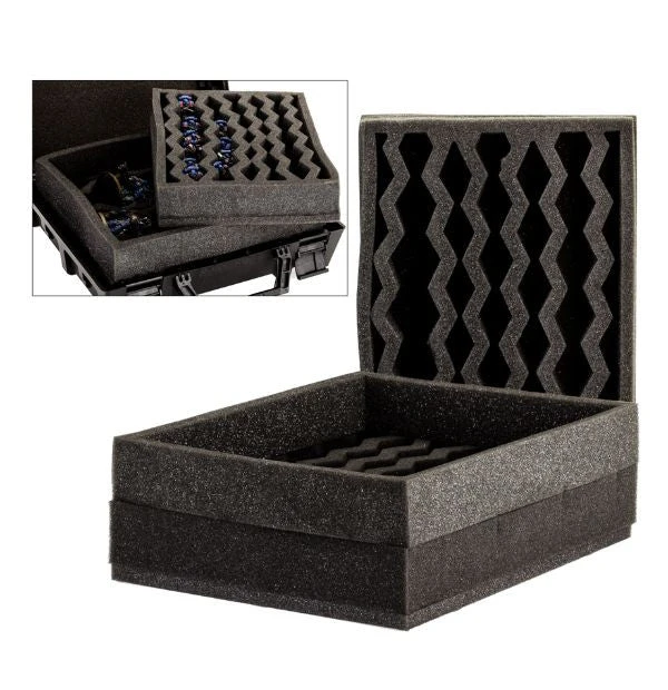 We know that you want the best protection for your miniatures – the foam inside the case is slightly larger than the case itself, and will compress around the figures when closed, ensuring a minimum of movement for any miniature.. It also has nylon catches, so if you should drop it the catches won’t break. To ensure the robustness of the stress points, a metal hinge runs along the back, strengthening and adding a reassuring weightiness.. We also know that space can be at a premium when storing models, so the Skirmish and Battle cases have been designed to stack on top of each other for easy storage.