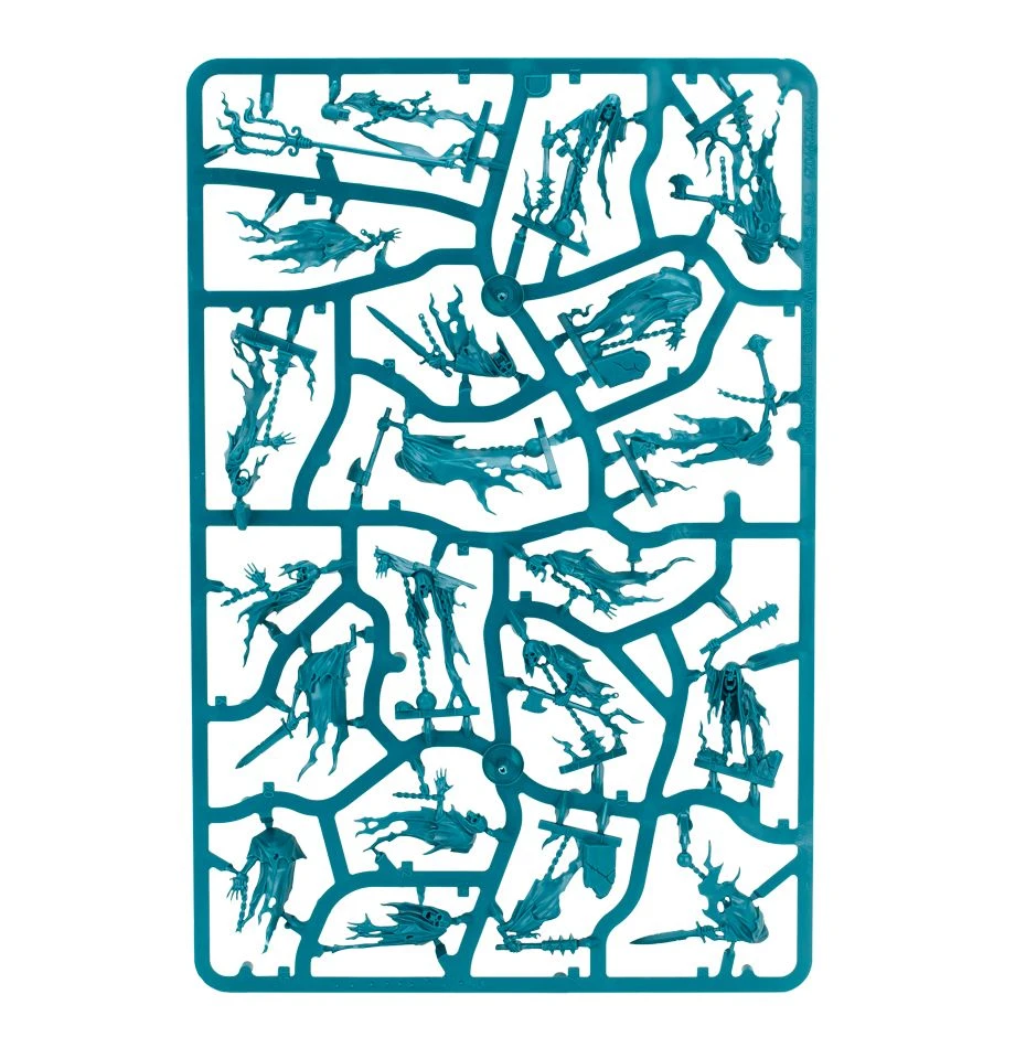 The most numerous of all the spirits that join Nighthaunt processions are the Chainrasp Hordes. These gheists are created from the spirits of the most vicious and irredeemable criminals to have lived in the Mortal Realms. They are lesser spirits, held together in the afterlife by nothing other than their own never-ending spite and all-consuming madness, a negative energy which saps the will of their enemies. Chainrasps may have thought death to be an escape from terrible imprisonment but, in truth, it was merely the beginning.