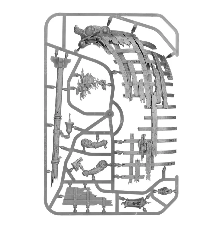 This multi-part plastic kit contains the components necessary to assemble a Gloomtide Shipwreck. This is an Etheric Vortex scenery piece, which models with the Idoneth Deepkin allegiance have access to. The Shipwreck itself is a sea-dessicated hull, the skeleton of some long-forgotten vessel now home to barnacles, coral and creatures sympathetic to the Idoneth. The model is in 2 pieces, which can be placed separately on the battlefield, or together to form one wrecked hull – each section is encrusted with barnacles, littered with bones and trinkets, and feature ship details such as a broken sextant, a ruined rudder, a lantern and a ship’s bell. Alluding to the wreck’s former life, there are plenty of Sigmarite details, with a figurehead holding a hammer, a twin-tailed comet on the mast and a plaque at the rear. Also included are 6 shoals of sea creatures – these can be added to the wreck as you please, though make excellent additions to the base of any Idoneth Deepkin miniature.