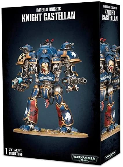 This multipart plastic kit builds one Knight Castellan, a titanic long range Lords of War choice for your Imperial Knights army – or a wandering Freeblade for other Imperium forces. This super-heavy walker is armed with a blast-unleashing plasma decimator, an armour-melting volcano lance, and an array of carapace-mounted meltaguns, shieldbreaker cannons, and missiles.
