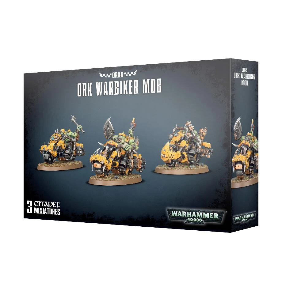 This boxed set contains 3 multi-part plastic Ork Warbikes, and includes options for an Ork Nob on Warbike, a variety of wargear options and extra details.