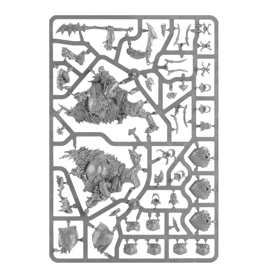 This multi-part plastic kit contains all the parts necessary to assemble three orruk Gore-gruntas, savage orruks riding massive, armoured, betusked beasts. The orruks can be armed with pig-iron choppas, or jagged gore-hackas, with an optional Gore-grunta boss featuring his own head, weapon and grunta options. 100 components in total, with three Citadel 90x52mm Oval bases.