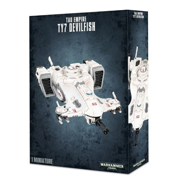 This boxed set contains 1 multi-part plastic T’au Devilfish APC with a variety of optional parts and weapons.