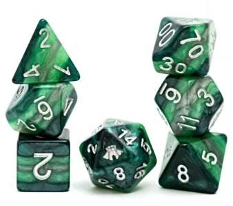 - 7-Die Sets – Contains a d4, d6, d8, d10, d% (00), d12 and a d20.