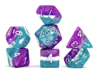 - 7-Die Sets – Contains a d4, d6, d8, d10, d% (00), d12 and a d20. Ships in a Dice Keep!