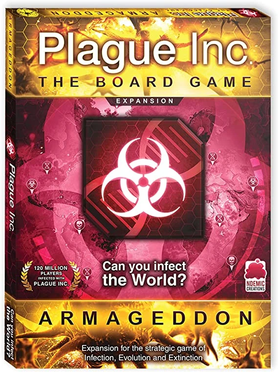Plague Inc: Armageddon is the first major expansion for the critically acclaimed Plague Inc: The Board Game. Infect the world with two radically different disease types, use powerful game-changing genes, deal with Brexit Britain, play with an extra player and a whole lot more.