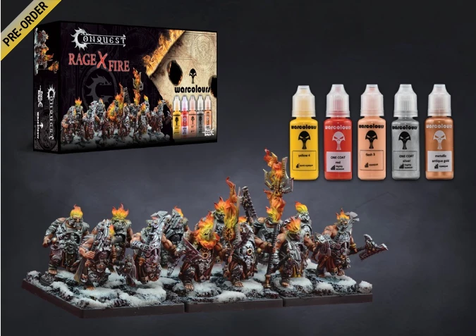Warcolours paints and Conquest collaborated on a new look for the Dweghom Flame Berserkers. Rage X Fire brings a bright look using the high quality acrylic paint of Warcolours and the fine sculpting of Conquest together in a new boxed set. These 12 Flame Berserkers are ready for action, especially after you paint them with the 5 specially chosen Warcolours paints included in this set. The lead painter of Conquest and the team at Waarcolours chose colors that bring out the personality of this infantry.Â
