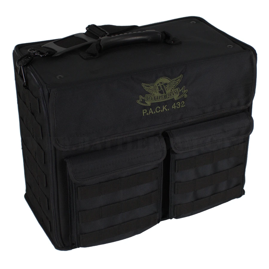 The P.A.C.K. (Personal Army Combat Kit) 432 can fit 8 inches (203 mm) of Battle Foam Large (BFL) size foam trays (15.5W x 12L”) or 13 inches (330 mm) of Battle Foam Medium (BFM) size foam trays (15.5W x 8L”). Its rugged, black Ballistic Nylon exterior protects a hard plastic interior built for strength and durability. This bag was designed for airport travel and meets all FAA regulations for carryon luggage. The P.A.C.K. 432 now offers a molle system, which allows you to further customize this bag to fit your specific storage and transportation needs. Molle accessories offer storage solutions for tablets and other small books, dice and other gaming accessories as well as cell phones and other personal items. To view and/or purchase these accessories, click here.